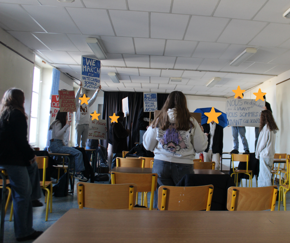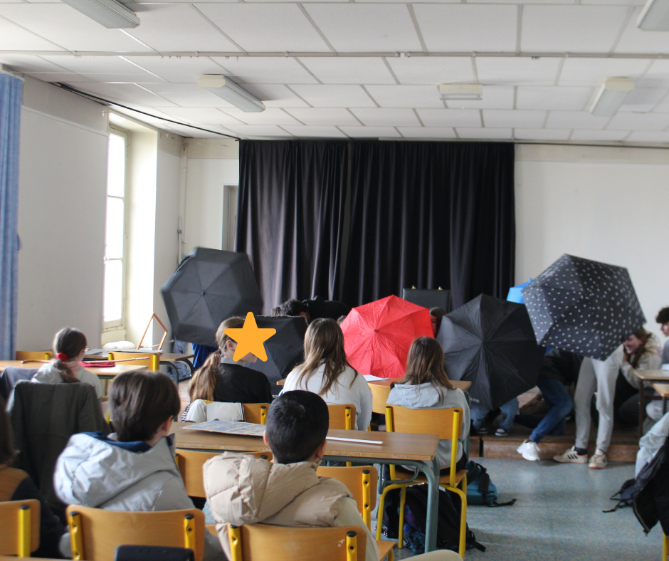Ce 20 mars 2025, nous étions toutes les trois ensemble dans une salle de classe, au collège Descartes de Châtellerault. Un groupe de collégien·nes est monté sur scène pour porter une histoire qu’ils et elles ont contribué à écrire. Une histoire à base de protection des droits LGBTQIA+ face à un grotesque Donald Trump, d’élection sans candidates, de vie dans les arbres et de rêves d’égalité, de préservation des biens communs et de partage suspendus sous des parapluies colorés…